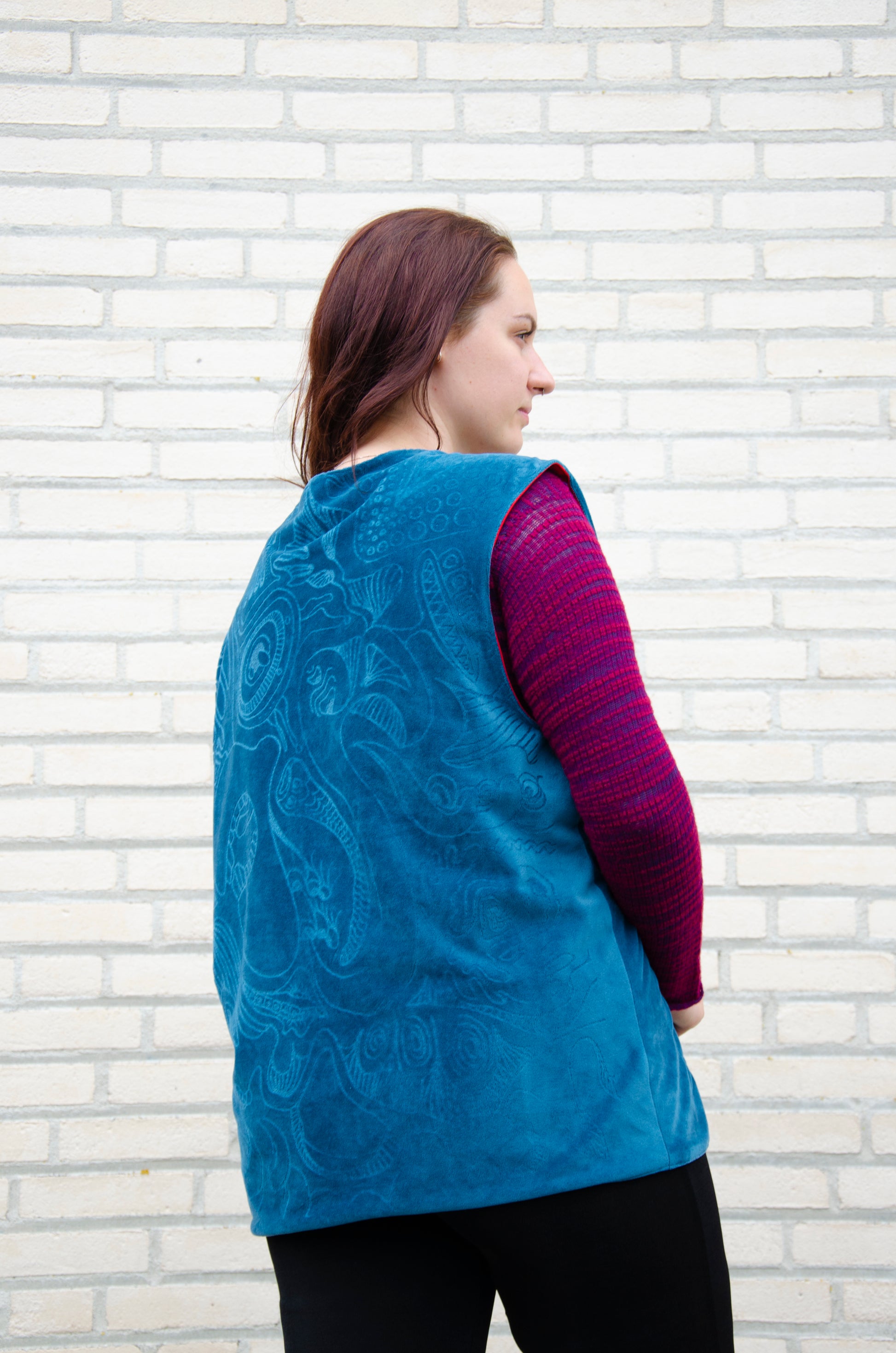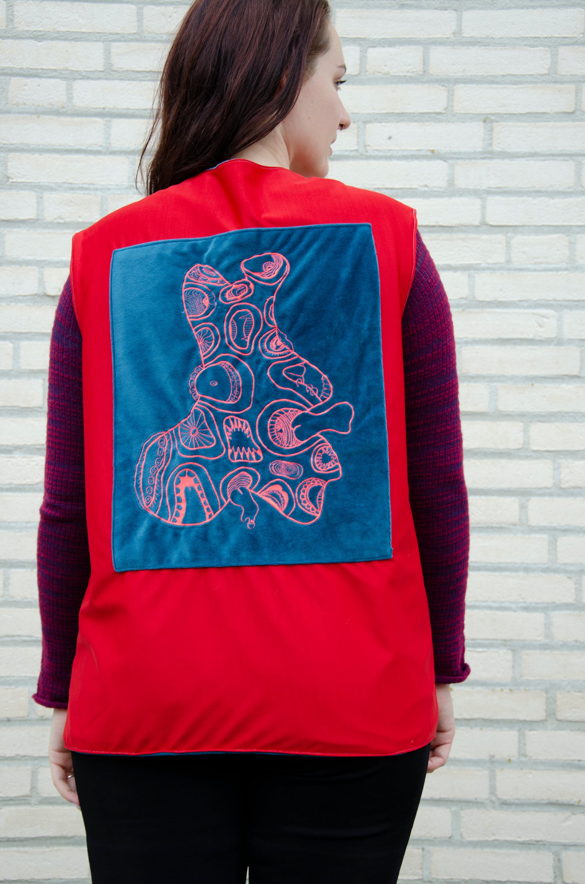 A custom-made, reversible vest that blends storytelling with texture.