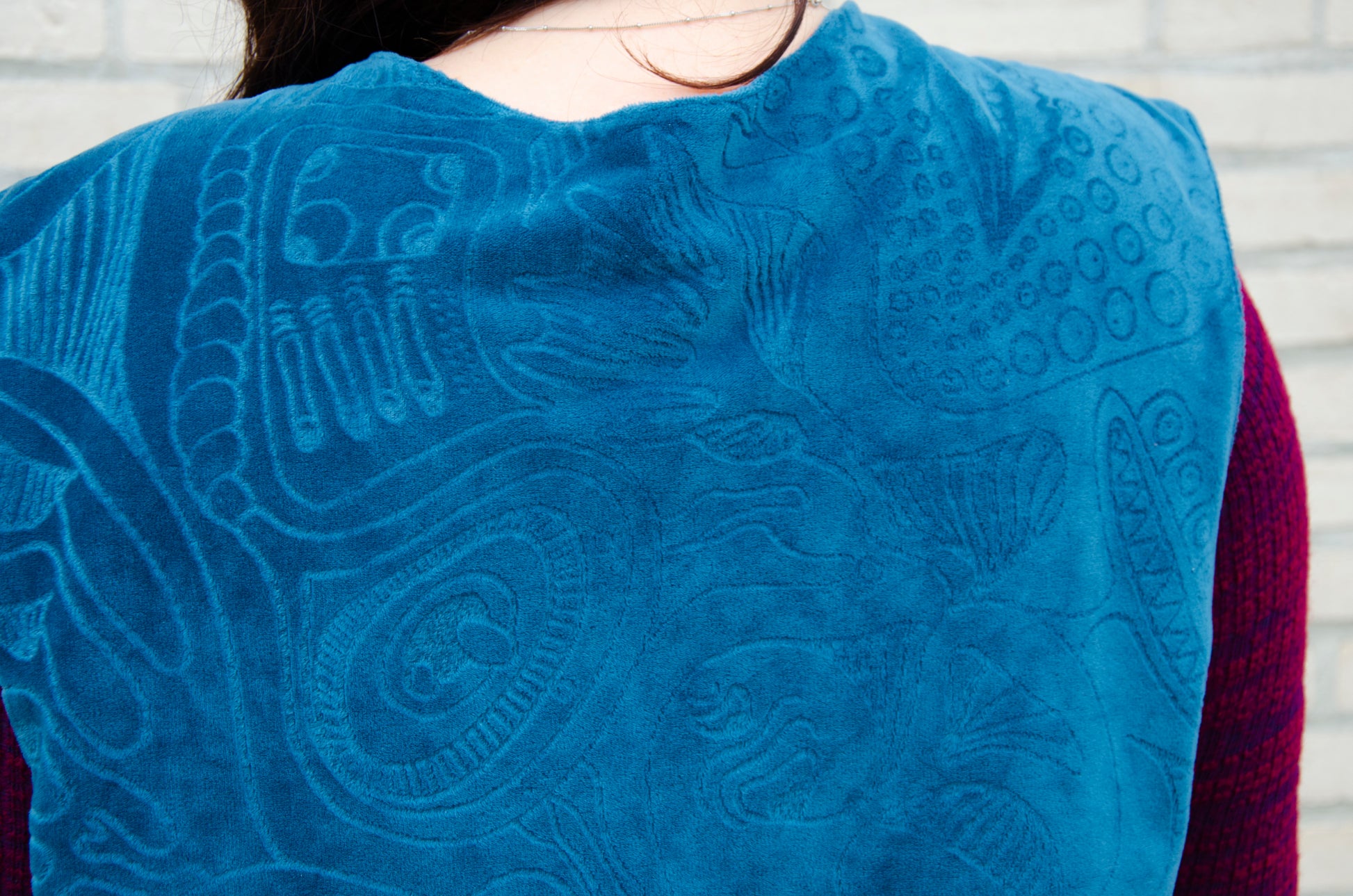 One side features deep blue velvet etched with original drawings of imaginary deep sea creatures — laser-engraved to bring their details to life. Flip it over, and you’ll find a vibrant red side with a custom embroidered design on the back and a flowing pattern on the front.